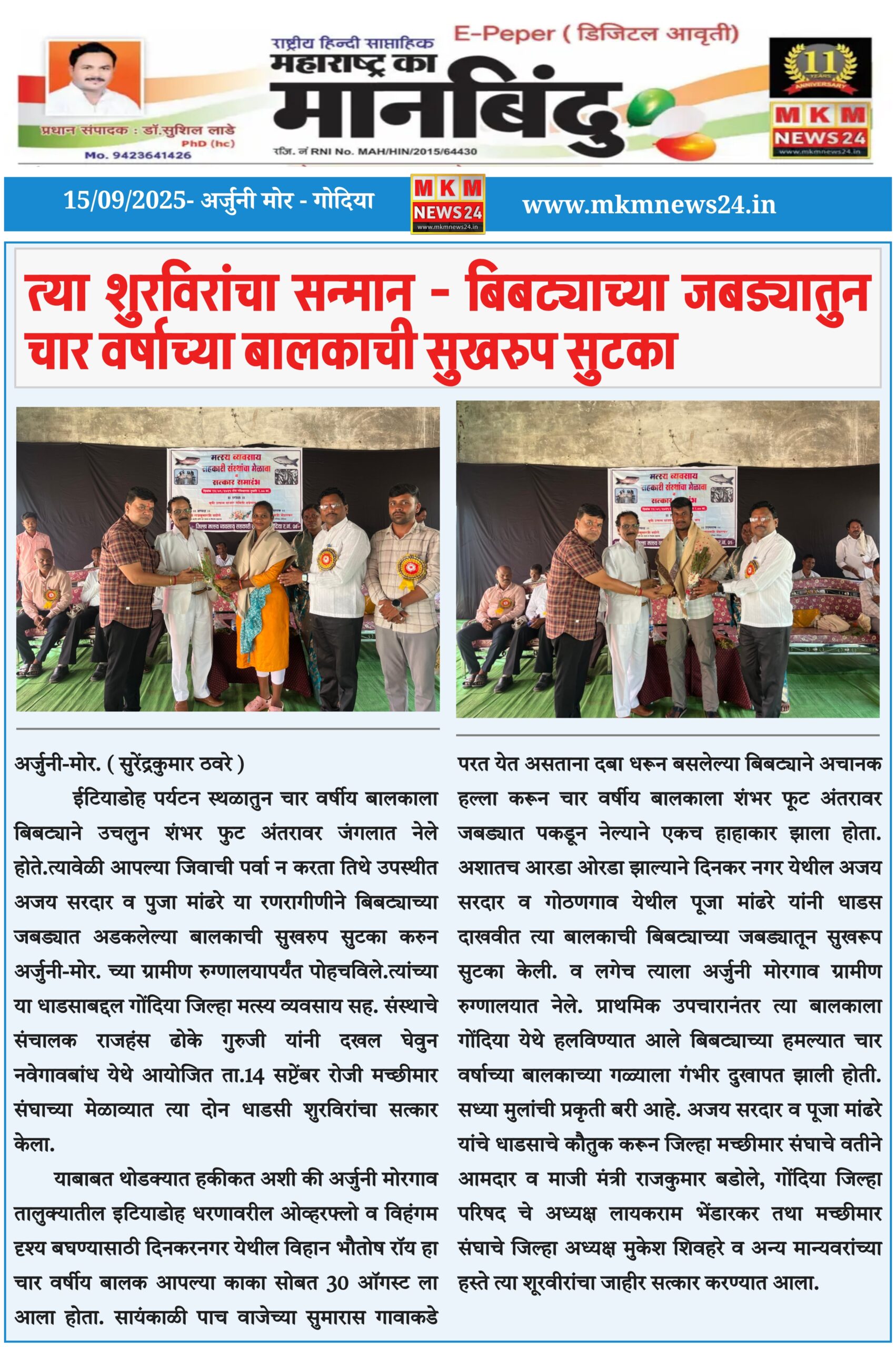 अर्जुनी मोर बिबट्याच्या जबड्यातुन चार वर्षाच्या बालकाची सुखरुप सुटका करणाऱ्या सुरवीरांचा सन्मान September 15, 2025 editor Post Views: 816