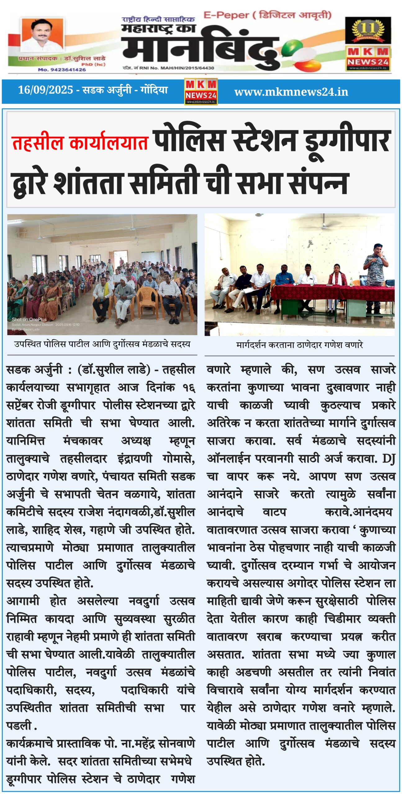 सड़क अर्जुनी पोलिस स्टेशन डूग्गीपार द्वारे शांतता समिती ची सभा संपन्न September 16, 2025 editor Post Views: 592