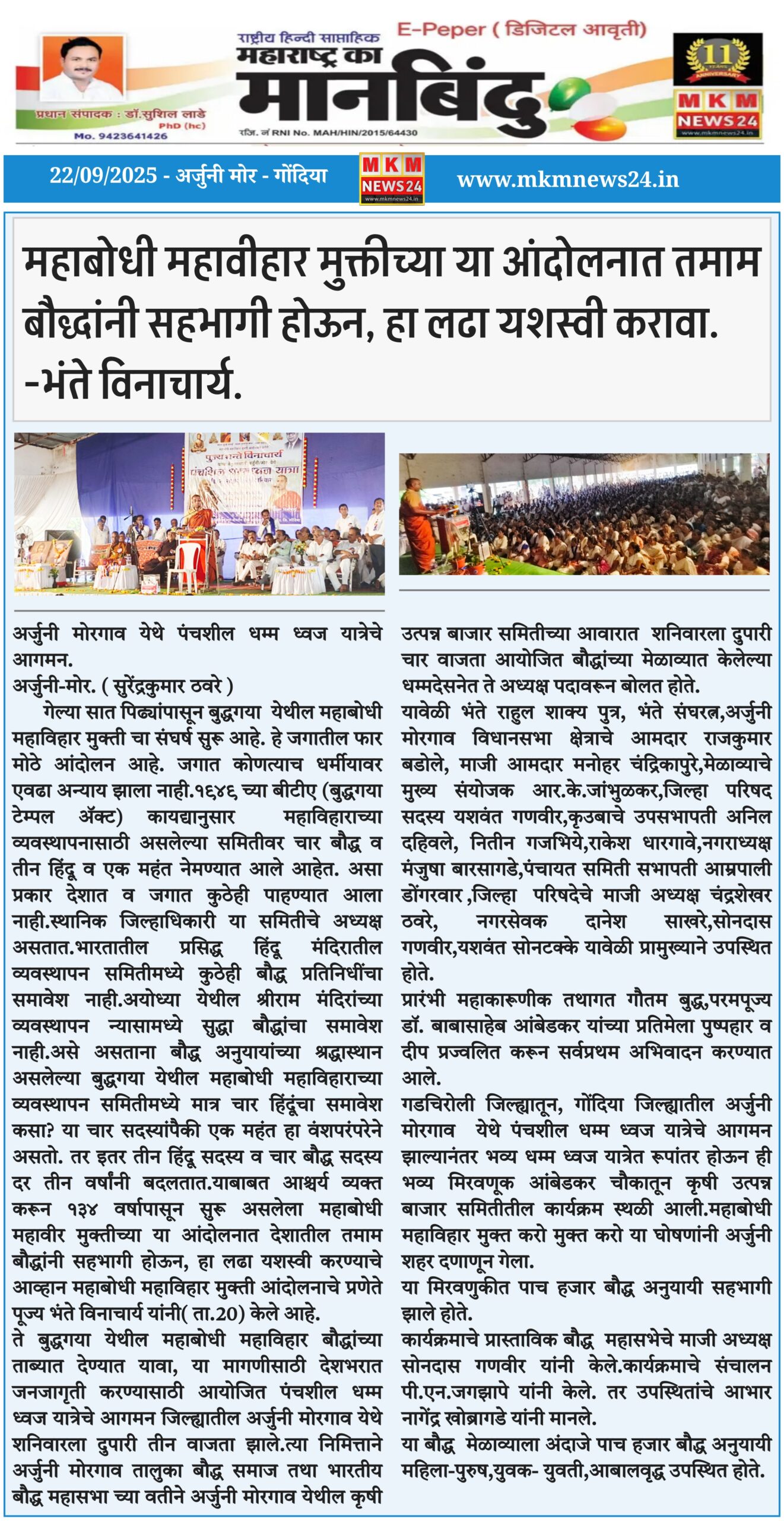 अर्जुनी मोर महाबोधी महावीहार मुक्तीच्या या आंदोलनात तमाम बौद्धांनी सहभागी होऊन, हा लढा यशस्वी करावा. -भंते विनाचार्य September 22, 2025 editor Post Views: 349