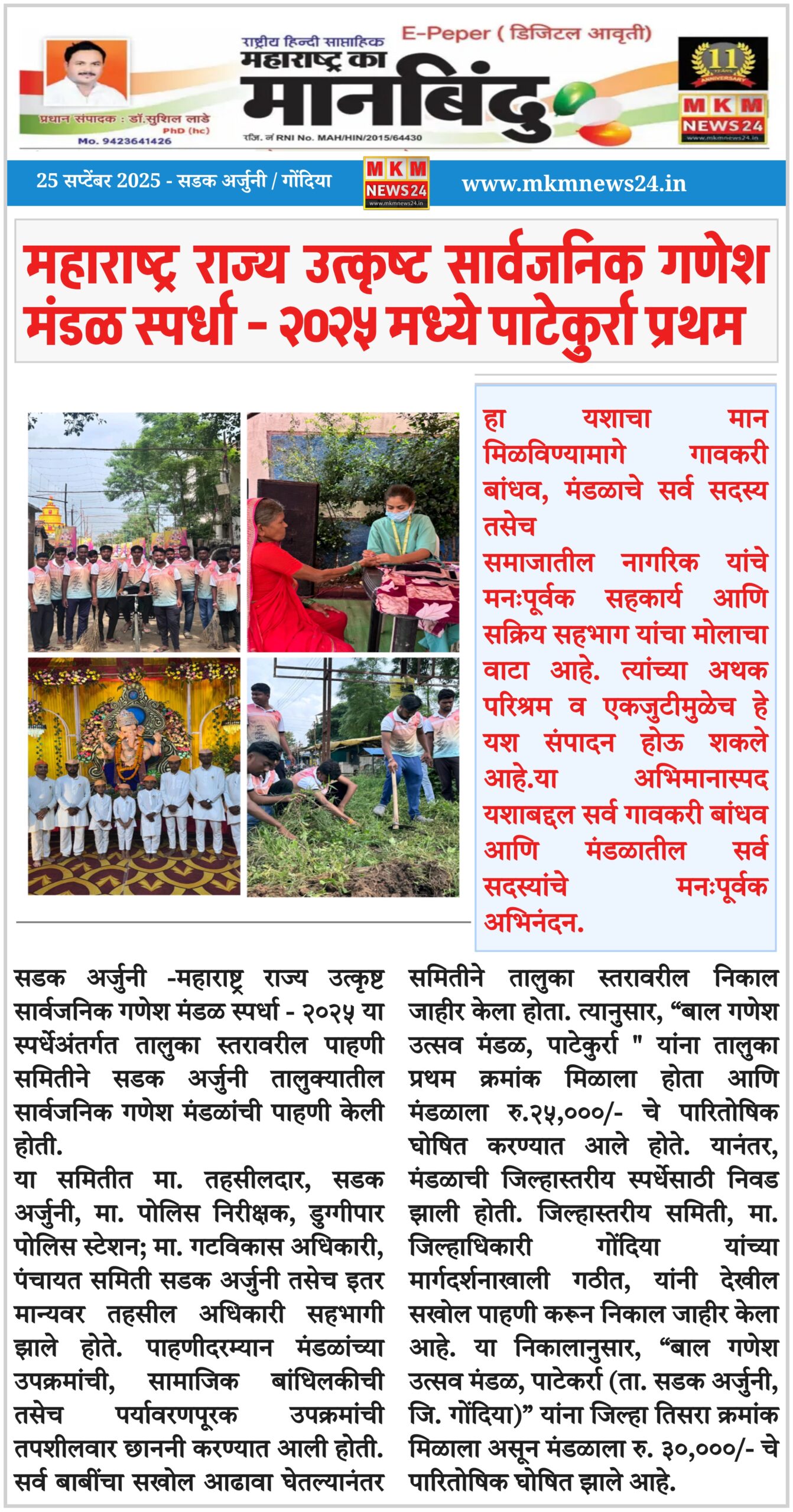 सड़क अर्जुनी महाराष्ट्र राज्य उत्कृष्ट सार्वजनिक गणेश मंडळ स्पर्धा – २०२५ मध्ये पाटेकुर्रा प्रथम September 25, 2025 editor Post Views: 305