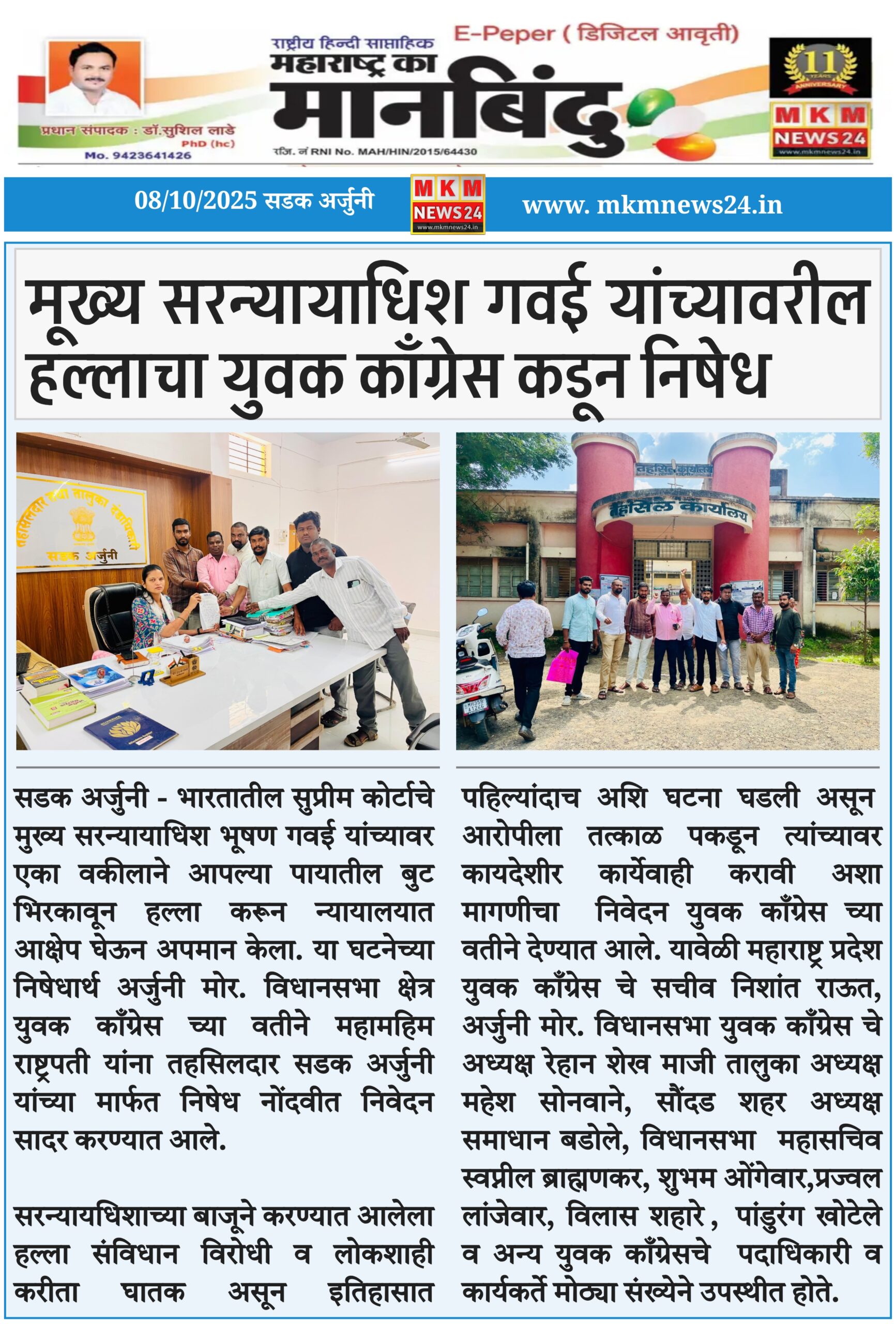 सड़क अर्जुनी मूख्य सरन्यायाधिश गवई यांच्यावरील हल्लाचा युवक काँग्रेस कडून निषेध October 8, 2025 editor Post Views: 106