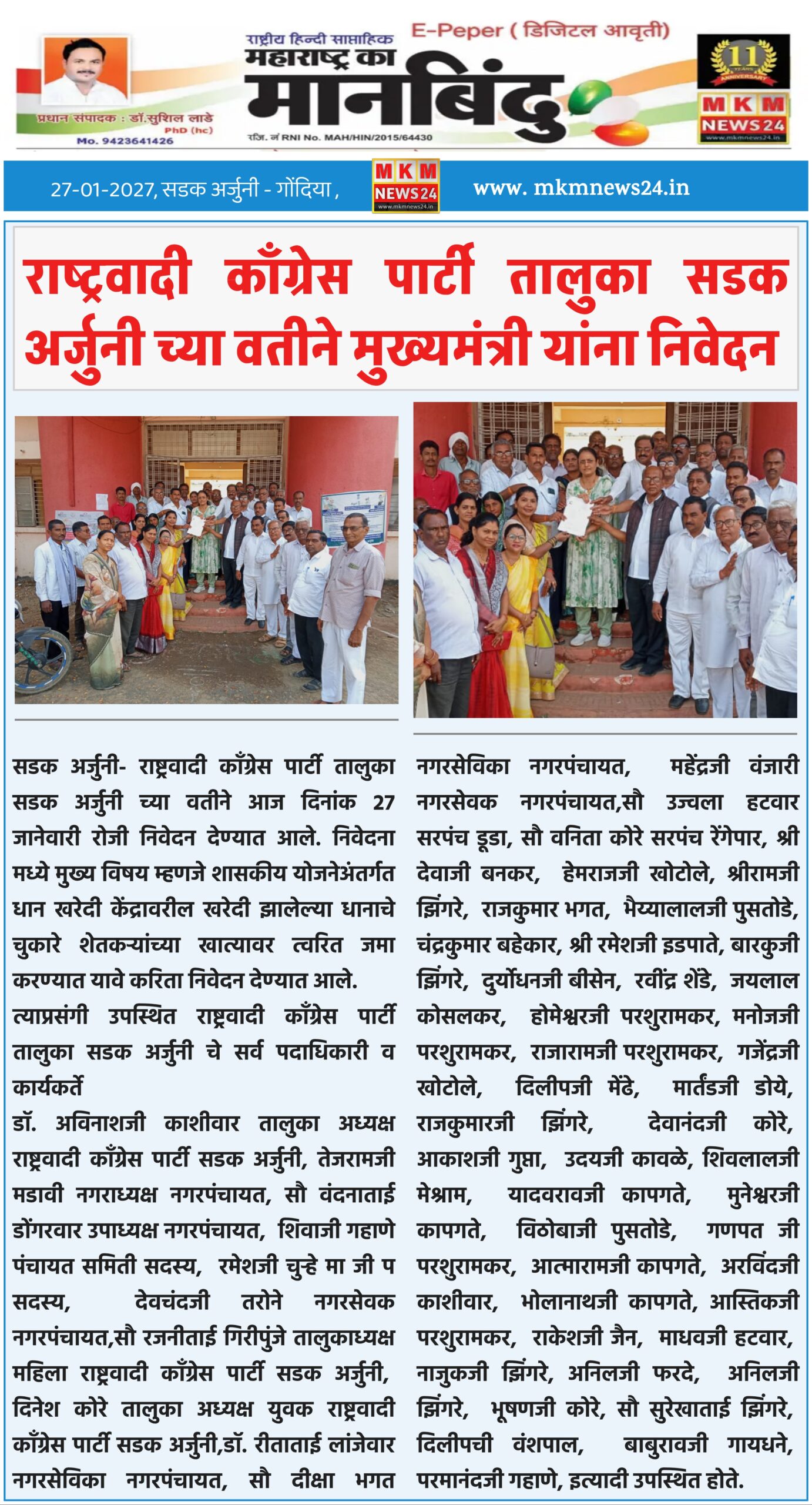 सड़क अर्जुनी राष्ट्रवादी काँग्रेस पार्टी तालुका सडक अर्जुनी च्या वतीने मुख्यमंत्री यांना निवेदन January 27, 2026 editor Post Views: 105