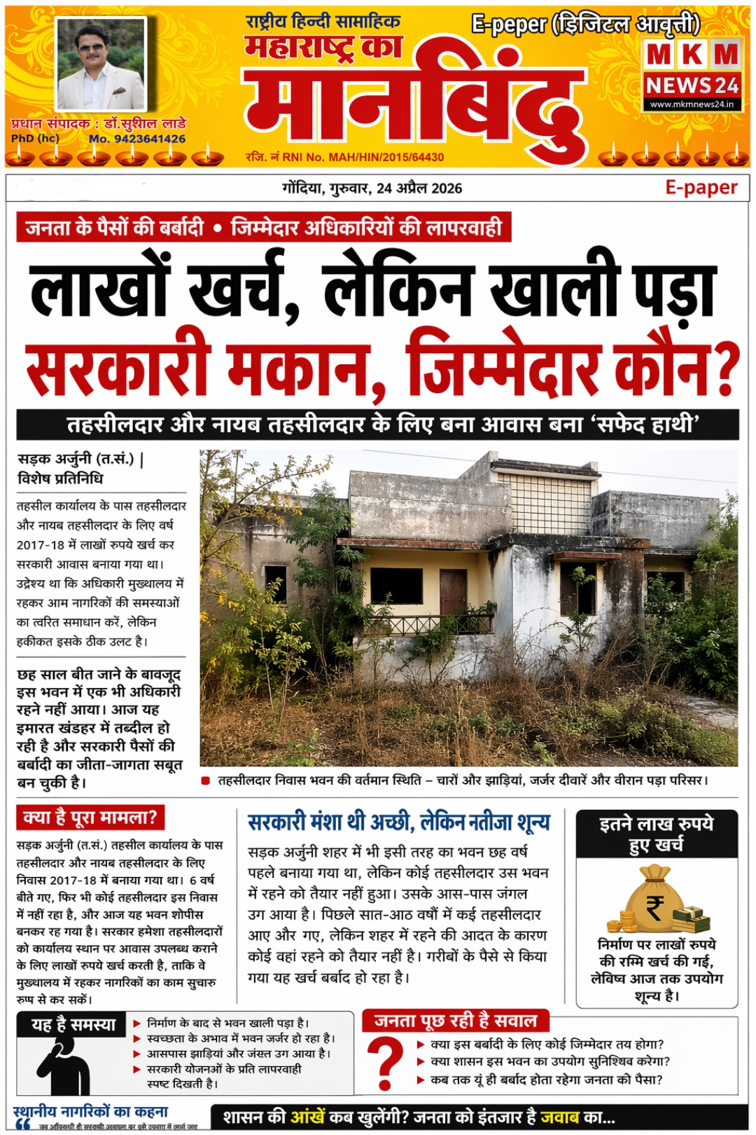 सड़क अर्जुनी लाखों खर्च, लेकिन खाली पड़ा सरकारी मकान, कौन है जिम्मेदार? April 23, 2026 editor Post Views: 61