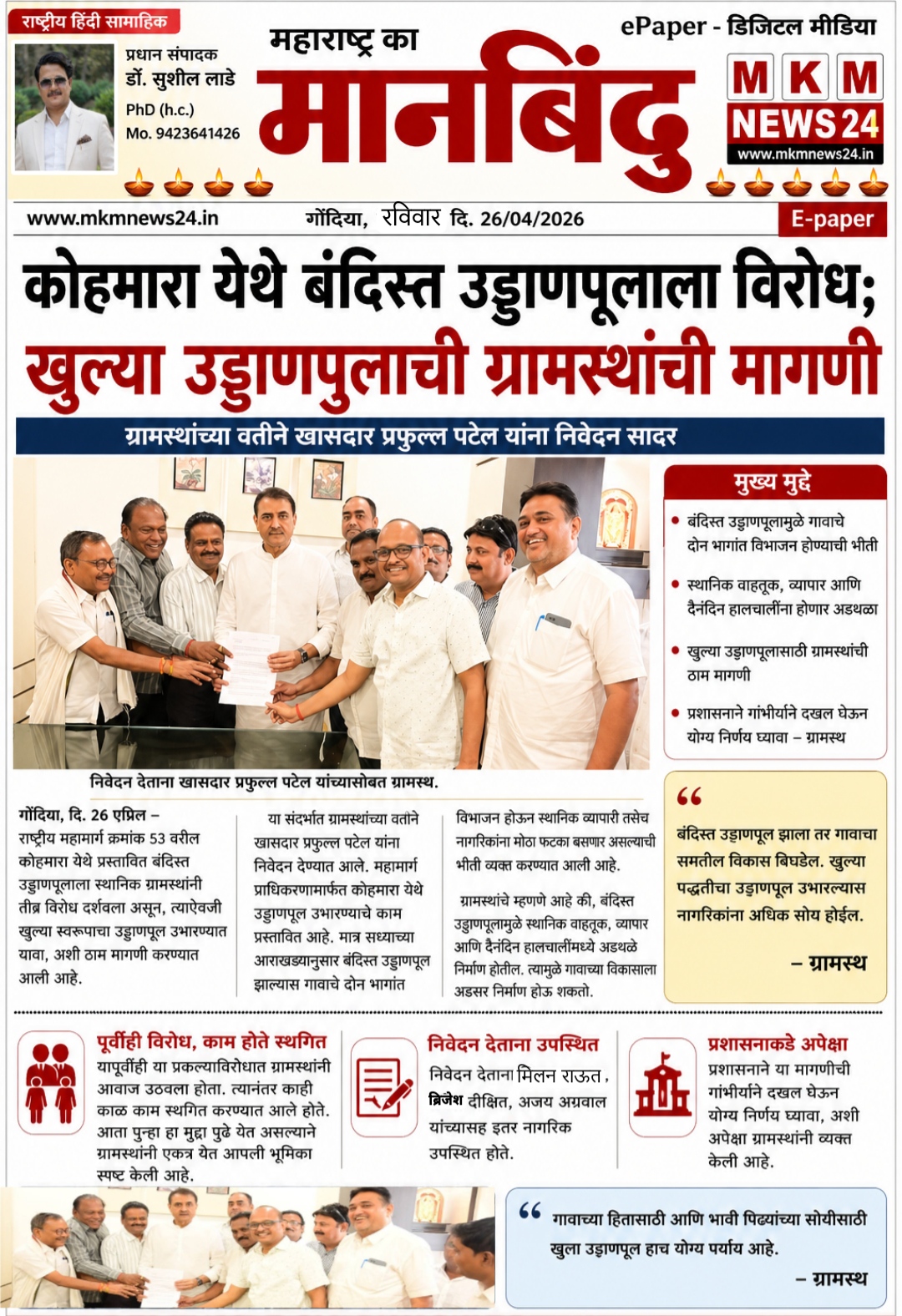 गोंदियासड़क अर्जुनी कोहमारा येथे बंदिस्त उड्डाणपूलाला विरोध; खुल्या उड्डाणपुलाची ग्रामस्थांची मागणी April 26, 2026 editor Post Views: 46